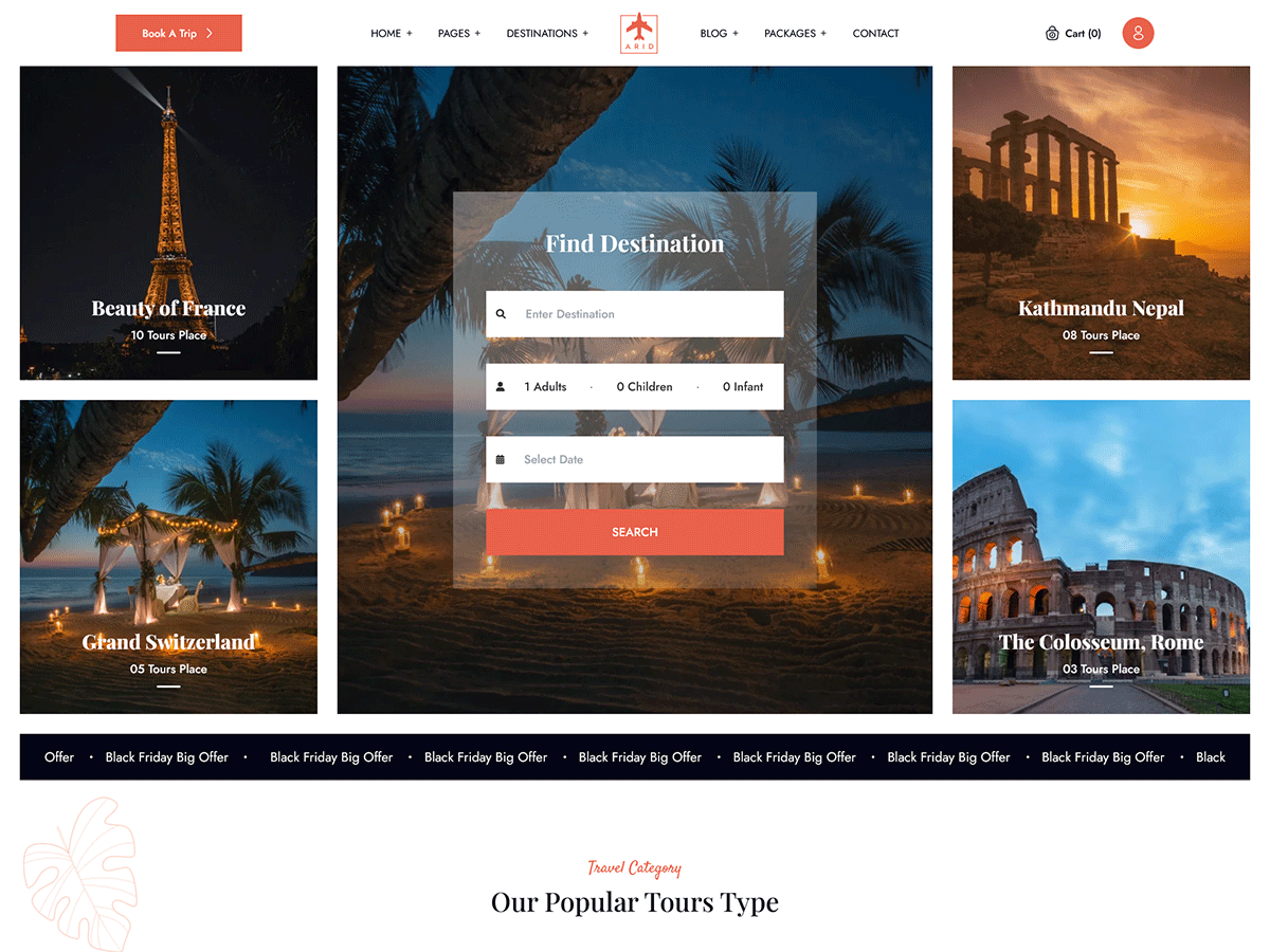 Arid is a Wordpress theme to create a website for any type of Business specially for travel agency, including: tours, hotel booking, activity/event, travel experiences, online booking, room bnb, villa rental, holida y rental, resort rental, cruises, car rentals, real estate, flight ticket, and more. Arid comes with powerful features. Arid is a clean responsive wordpress theme. It includes Elementor plugins free with theme. The theme comes with the option of contact form to allow users to contact you. Arid is fully compatible with latest version of plugins to allow you easy handling. The Arid comes with one click demo and also more flexible features.