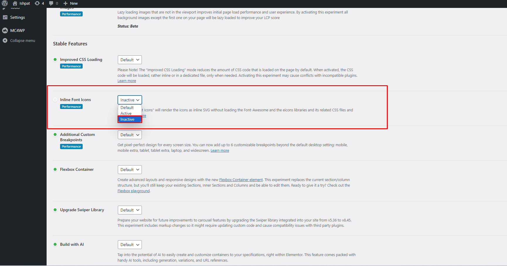Dashboard ElementorSettingsFeaturesInline Font Icons